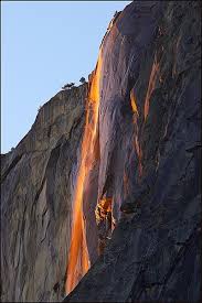 El momento de la cascada de fuego dura apenas unos minutos, cuando el sol se pone, su luz naranja sobre la caída de agua temporal en la ladera este del promontorio rocoso que en su parte más alta alcanza los 910 metros. La intensidad de la luz por efecto del sol crece hasta que el acantilado parece simular una estrecha caída de lava que fluye hasta el abismo.